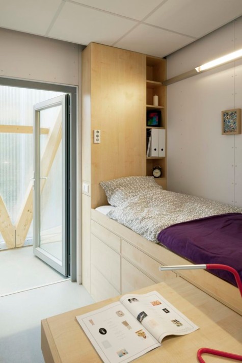 Die Kuben sind paarweise gestapelt und haben eine Grundfläche von je circa 9,5 Quadratmetern. Jeder Kubus ist mit einer vorgefertigten Sanitärzelle und Einbaumöbeln ausgestattet. So konnten für insgesamt zwölf Personen optimierte private Zellen geschaffen werden.