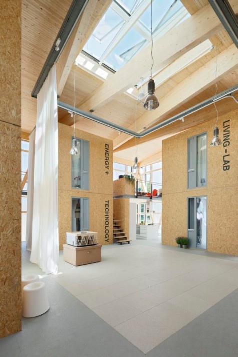 Zusätzlich war es aufgrund des unkonditionierten Innenraums notwendig, die solaren Erträge zu optimieren und gleichzeitig die Transmissionswärmeverluste über die Hüllfläche in einem wirtschaftlichen Rahmen zu begrenzen, um den angestrebten Plusenergiestandard zu ermöglichen. Aus diesem Grund sind Dach- und Bodenfläche in hochwärmegedämmter Bauweise ausgeführt. Die Fassade wurde durch die Anordnung des Tragwerks hinter der Außenhaut von jeglicher statischen Funktion befreit und als klassische Vorhangfassade konzipiert. Der Wunsch, dem Baukörper Leichtigkeit zu verleihen, konnte durch transluzente Polycarbonatplatten mit mehrfachem Luftkammeraufbau realisiert werden. Die Fassaden sind aus vertikalen circa 50 Zentimeter breiten gebäudehohen Polycarbonatelementen rahmenlos gefügt und erzeugen durch ihre umlaufend homogene Fläche im Inneren eine Grundhelligkeit, die dem Außenraum nahekommt. Von außen lassen sich die Fachwerkdiagonalen und die privaten Wohnkuben erahnen. Gleichzeitig werden mit einem Gesamtenergiedurchlassgrad (g-Wert) von 0,41 W/m2K und einem Wärmedurchgangskoeffizienten (U-Wert) von 0,71 W/m2K die gewünschten bau- physikalischen Parameter erreicht.