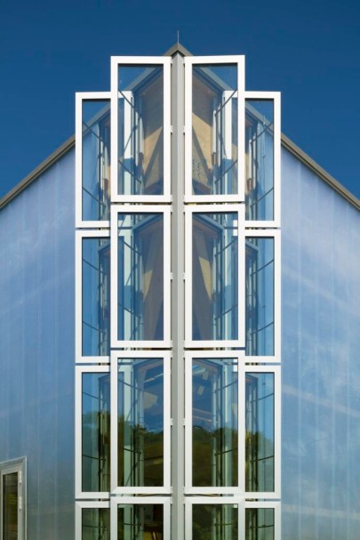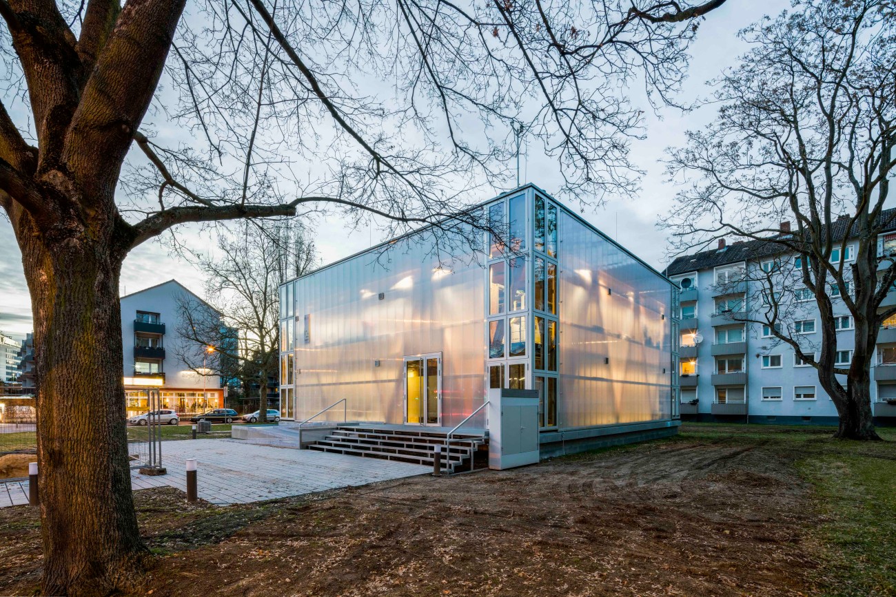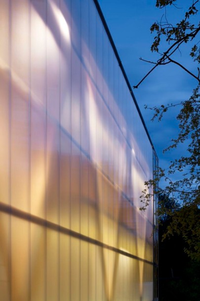 Um den ambivalenten Charakter des Hallenraums zwischen Innen und Außen herauszuarbeiten, war es wichtig, diese Introvertiertheit auch in der Gestaltung der Fassade zu spiegeln. So ist die transluzente Hülle Ausdruck für die Gemeinschaft.