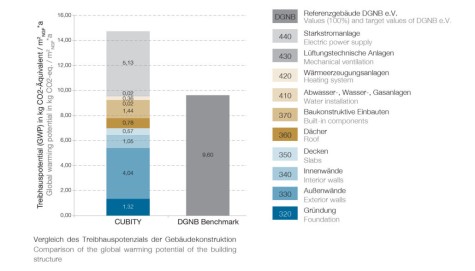 CUBITY hat in allen betrachteten Umweltwirkungen geringere Emissionen als ein konventionelles Gebäude mit einer Energieversorgung gemäß geltender Energieeinsparverordnung (Gas-Brennwertkessel mit Solarthermie, Abluftanlage). In sechs der sieben Wirkungskategorien unterschreitet CUBITY zum Teil deutlich die Zielwerte der DGNB für ein nachhaltiges Gebäude.