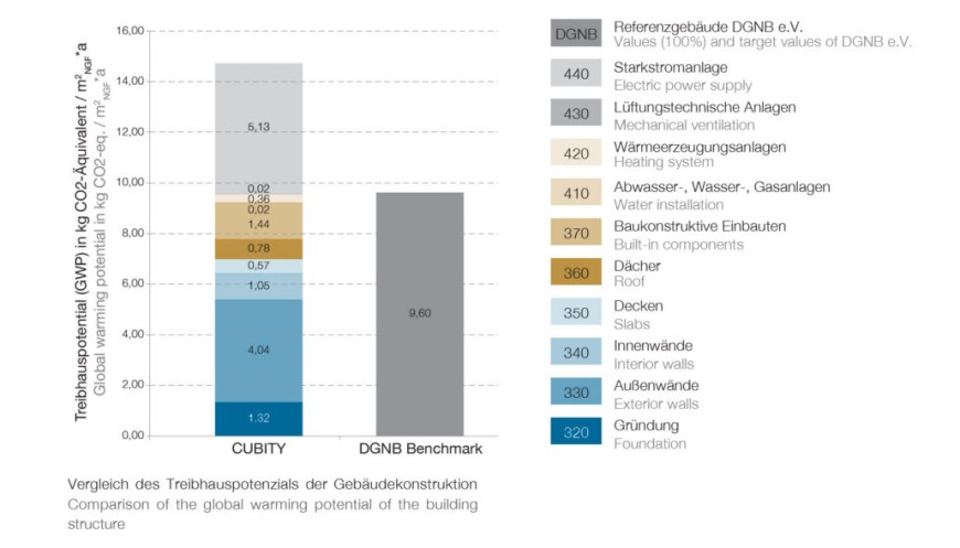 Für die Ökobilanzierung von Gebäuden wurde von der Deutschen Gesellschaft für Nachhaltiges Bauen (DGNB e. V.) auf Basis der internationalen Normen eine Reihe von Festlegungen getroffen, die eine Vergleichbarkeit gewährleisten. Für die Ökobilanzierung von CUBITY wurden die Regelaufbauten der Bauteile und ihre Mengen im Gebäude bewertet, Anschlüsse blieben unberücksichtigt. Für die Berücksichtigung des Gebäudebetriebs wurden die EnEV-Berechnung und die Ertragsberechnung der PV-Anlage verwendet. Die Bewertung erfolgte im Vergleich mit den Referenzwerten der Deutschen Gesellschaft für Nachhaltiges Bauen für den Neubau von Wohngebäuden mit mehr als sechs Wohneinheiten in der Version 2012 (NWO12).