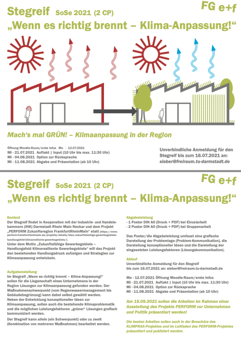 Das Fachgebiet e+f bietet im SoSe 2021 einen 2-CP-Stegreif zum Thema „Klimaanpassung in der Region“ an.
