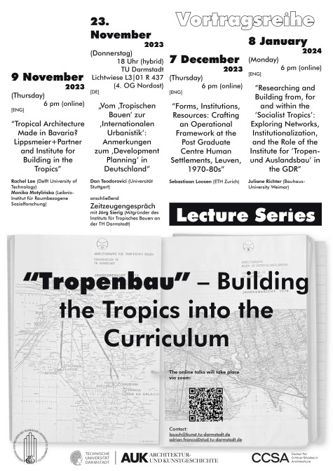 Die Vortragsreihe ist Teil des Forschungsseminars zur Geschichte des Instituts (Arbeitsgruppe) für Tropisches Bauen an der damaligen TH Darmstadt, veranstaltet von Adrian Franco und Frederike Lausch im Wintersemester 2023/24. Sie ist eine Kooperation zwischen dem Fachgebiet Neuere Geschichte und dem Fachgebiet Architektur- und Kunstgeschichte an der TU Darmstadt und wird von der Vereinigung von Freunden der Technischen Universität zu Darmstadt e.V. gefördert.
