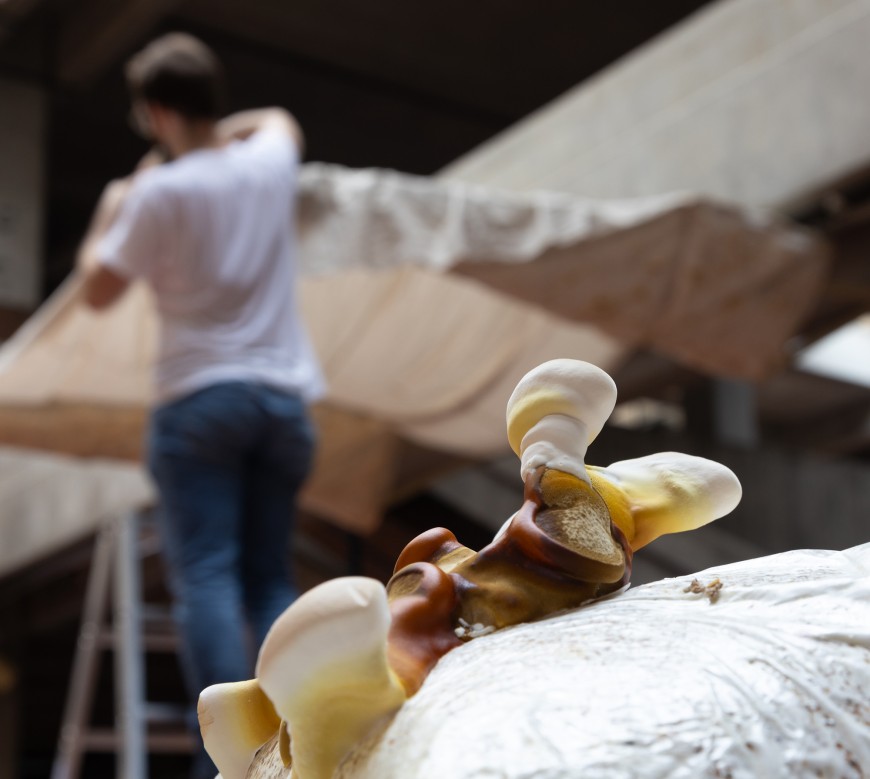 Entwerfen und Arbeiten mit einem Materialsystem aus Mycelium und Textilien bringt Herausforderungen mit sich. Anhand eines Demonstrators wird erforscht, wie man im Entwurf mit den besonderen Eigenschaften umgeht und ob das Komposit Material auch im 1:1 Maßstab den Anforderungen gerecht wird.