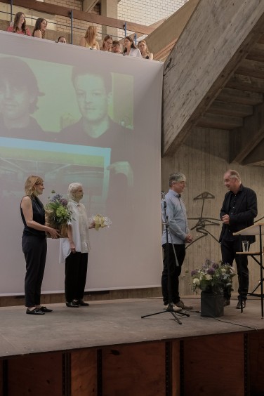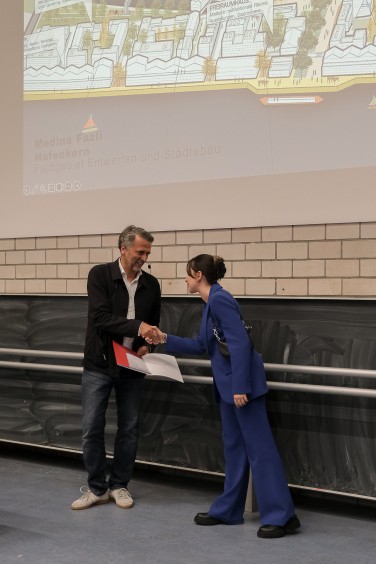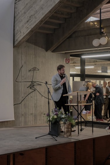 Die Feier der Masterabsolvent:innen fand wenig später im Max-Guther-Saal statt. Zuvor hatten die Herausgeber:innen der Masterarbeiten die Gäste durch die Ausstellung der Masterthesen geführt. Studiendekanin Elke Reichel begrüßte die rund 32 Absolvent:innen. Anschließend hielt Jan Friedrich, stellvertretender Chefredakteur der Bauwelt, die Festrede.