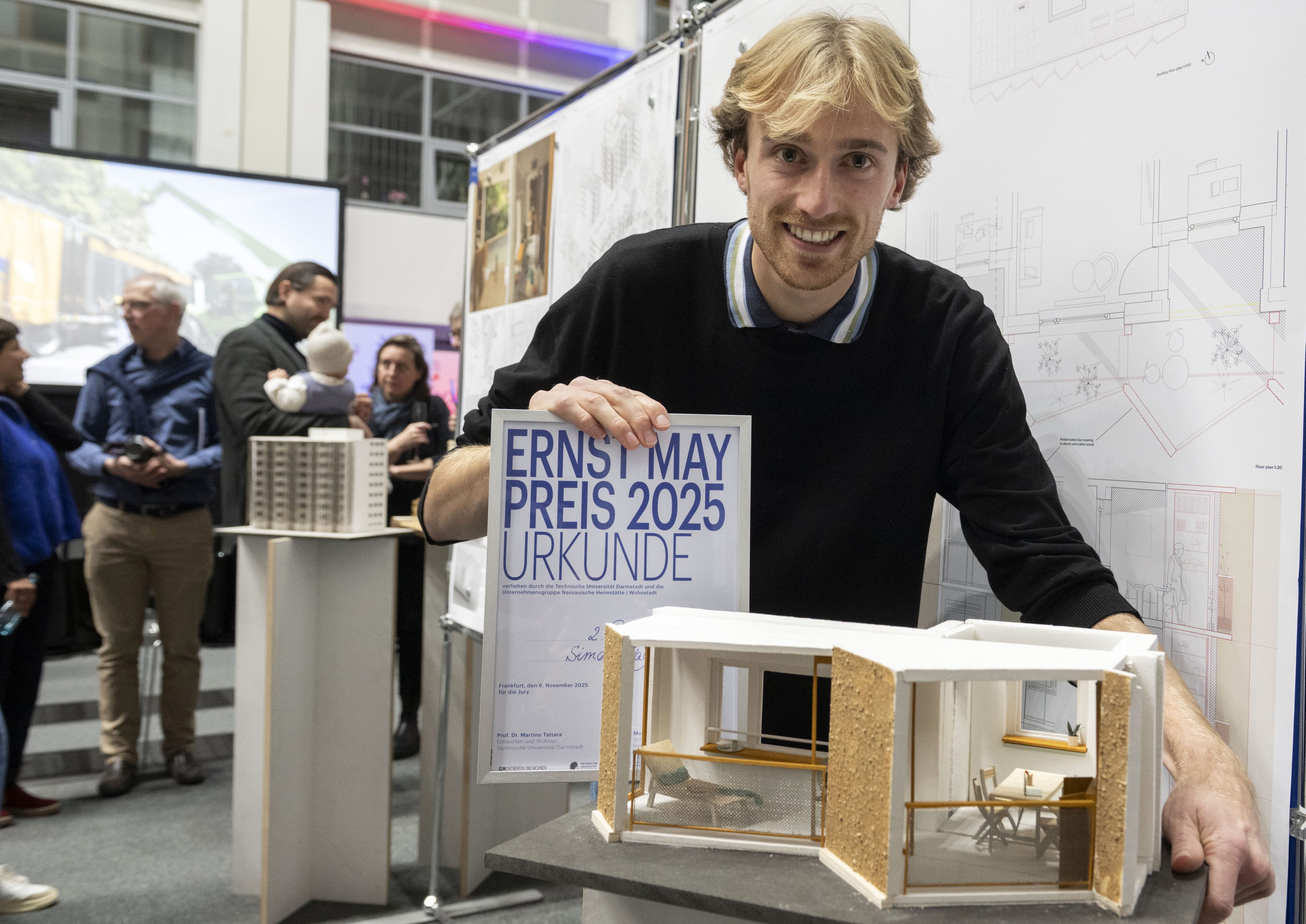 Katharina Lore Meyer, Simon Kallfaß, Franziska Schäfer und Thomasz Iwanek haben die 17. Auflage des Ernst-May-Preis (NHW Award Süd) gewonnen. Am Finaltag setzten sie sich mit ihren Arbeiten durch. Eine Anerkennung erhielt Luzie Geißler. Zuvor hatten NHW-Geschäftsführerin Monika Fontaine-Kretschmer, Martin Hunscher (Leiter Stadtplanungsamt Frankfurt) und Prof Dr. Martino Tattara (Fachbereich Architektur, TU Darmstadt) die Anwesenden im Atrium des Planungsamts der Stadt Frankfurt begrüßt und Prof. André Kempe (Leitung Institut für Entwerfen und Gebäudelehre, Leibniz Universität Hannover) sowie Prof. Sabrina Wirtz (Professur für Nachhaltiges Konstruieren und Entwerfen im Bestand, Hochschule Kaiserslautern) mit Vorträgen auf die feierliche Preisverleihung eingestimmt.