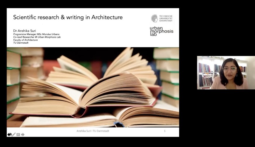 This webinar was designed as training session for faculty members and students of 3rd and 4th year who have Research in Architecture as a subject at Martha Mitra Mandal's College of Architecture. The first session focused on establishing framework for scientific academic writing and research, dwelling on topics such as– how to select relevant topics, conducting literature review, state of the art and methodology. The second session then through the example of interdisciplinary research on gender & sanitation, highlighted how research projects can combine case study and theoretical concepts in architecture and urban development planning.