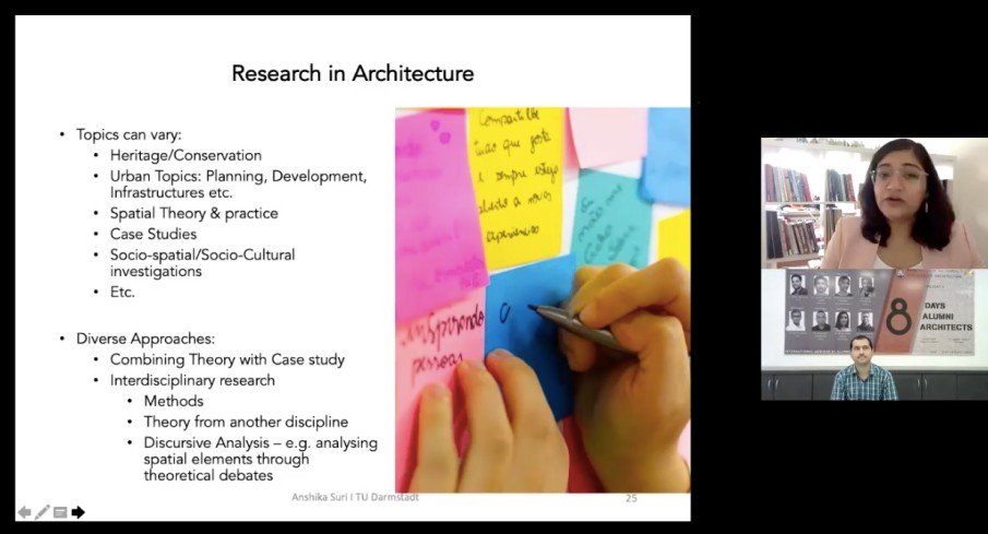 On Friday, August 27th, 2021, Dr. Anshika Suri provided a webinar on academic research in architecture with the example of gender studies for the students of Marathwada Mitra Mandal's College of Architecture in Pune, India. Dr. Suri discussed gender studies as part of research in architecture through the presentation of her PhD work.