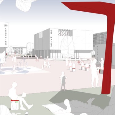 University education is evolving from a teaching format to individual learning. The university will provide a platform for individual competence acquisition by students, which demands less focus on a new large lecture hall and more on diverse learning landscapes with flexible spaces of various sizes and shapes. The goal of the university should be to seamlessly integrate face-to-face teaching with the increased use of digital teaching. The university campus will serve to promote social interaction among students and faculty. Alongside attractive outdoor learning spaces, the campus will include a „living room“ as a third place, providing a large, open learning landscape with spaces for encounters between students and local residents. New university buildings will be used hybridly. Following the principles of the „Productive City,“ the upper floors of the new university buildings will feature various housing forms, ranging from temporary student housing to community housing with rooftop terraces. The knowledge of the university will be combined with commercial ground floors and residential spaces to create a productive, sustainable city that will also benefit surrounding residential areas in Mainz.