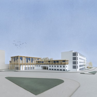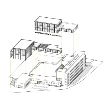 The main building with its distinctive head structures and the single-story extension of the original gymnasium will be raised and extended between the side corner buildings. The new sports hall will be designed as an independent building volume.