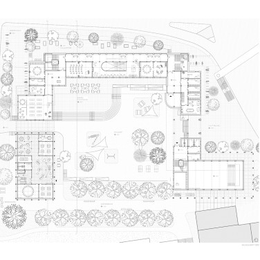 With the annexes opening into the courtyard and the newly structured zoning, the floor plan is freed from the linear dimensions of the corridor school and grows into a varied learning landscape. It extends through the visible external staircase to the courtyard, grove, and adjacent buildings. The house opens in the lowest floor to the street. The auditorium opens from the raised courtyard via a seating staircase to the forecourt. The parent-teacher café with library bridges between the main building and its surroundings on two levels. The workshops on the eastern side bring together young learners and teachers with creative people of all ages. The neighborhood is warmly invited to use the house during the evening and weekend hours.