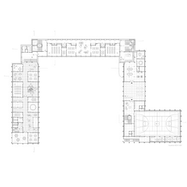 The basement and ground floor of the existing bar building are turned into a public, permeable zone and are connected by an open space with a seating staircase. Here, the spaces of the school district are located, such as the cafeteria and the library. Other public spaces, such as the teaching kitchen, youth center, sports area, and the (gymnasium) multi-purpose hall, are located in the building parts near the main entrance, making them directly visible and accessible from the neighborhood. The learning clusters are located on the upper floors of the existing bar building and in the new building on the northern part of the site.