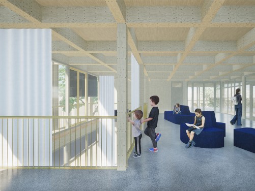 The placement of the new building frames the schoolyard, creating a protected space for children. The inviting materiality and delicacy of the timber construction, the small-scale arrangement, and the floor-to-ceiling windows create a child-friendly environment.