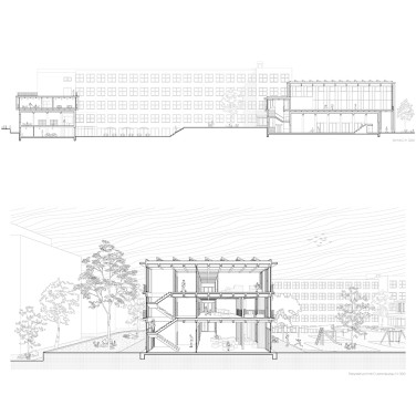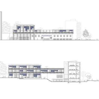 The entrances are decentralizable. The Holzhausentower contains public functions such as a cafeteria or library, while the annexes house functions for the school and the neighborhood, such as specialized classrooms, which can also be used for adult education courses. The design opens up outdoor spaces on the upper floors. All interior walls can be restructured if necessary.