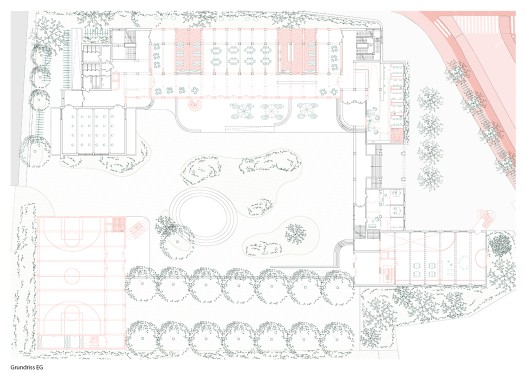 In terms of sustainability, the existing building volumes are optimally utilized. The topography is adjusted so that the basement of the existing structure is naturally lit. This creates a large seating staircase in the schoolyard, which invites movement and can be used for events.