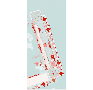 If we understand learning as a critical engagement with our surroundings, even the smallest detail enriches our imagination. In the reinforced concrete skeleton building by Martin Elsässer from the 1920s, we can see the attempt to develop a system that can accommodate regularly placed classrooms with many students using minimal materials. Broken down into its elements – the beams and columns – we can observe how carrying and loading functions. The frame can be supplemented with a structural system that references the existing building and stiffens it, but distinguishes itself in its materiality and form. Beetle-birch cross-laminated timber – CNC-milled according to the load path – allows us to shape the structure. At the same time, with the material remnants, we can form the internal partition elements after removing the non-load-bearing existing walls.