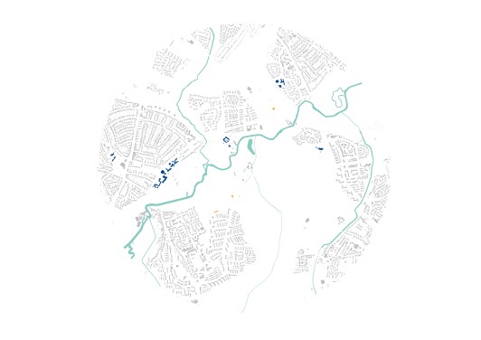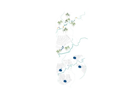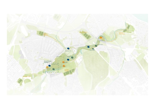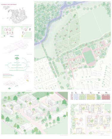 Along the Erft River, a continuous landscape strip connects the eight districts and forms a new center. At the same time, existing green corridors are enhanced and linked with new ones. The edges of the settlements are redefined, and the existing green corridors within the districts are given a new evaluation through the precise definition of entrances, the garden gates.