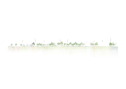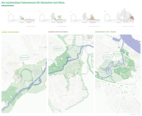 The Garden Erft as a sustainable living space for humans and animals. A biodiversity corridor connects green areas and creates a gentle transition from settlement to landscape. It is only interrupted by the garden gates and continues the green corridors within the districts. Its form adapts to the specific site conditions.