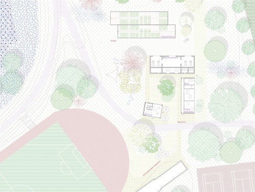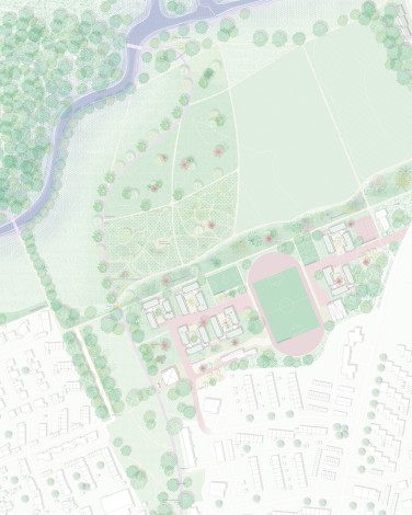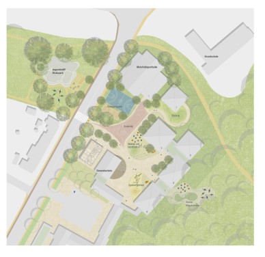 The analysis of the existing open space offerings reveals that, despite numerous sports facilities in the region, many of these areas are not accessible to the general public. Often tied to clubs, these spaces do not allow for spontaneous use by young people, students, and residents. Additionally, schoolyards are frequently paved and offer few nature-related movement or recreational areas. The Erft Valley represents an unused natural space with the potential to serve as the green heart of the neighborhood. Through targeted measures, it can be transformed into an open and versatile space for physical activity that promotes education, sports, and social interaction. In particular, the breakyard of the comprehensive school on the Erft is considered a model project to test innovative concepts for future schoolyards.