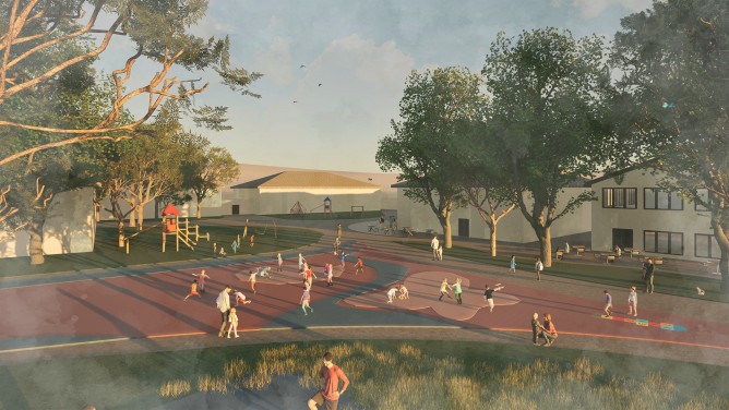 The redesign of the Erft Valley aims to activate it as an inclusive space for movement and interaction and enhance the quality of stay through nature-inspired and multifunctional spaces. The connection between residential areas, schools, and recreational spaces should be improved through pedestrian and cycling pathways. At the same time, the redesign of the breakyard at the comprehensive school on the Erft serves as a pilot project setting new standards for future school open spaces. The focus is on the connection between learning and movement. The schoolyard should not only serve as a break area but as an extended educational space that moves lessons outdoors and enables diverse learning methods.